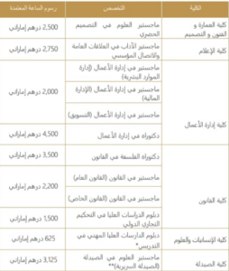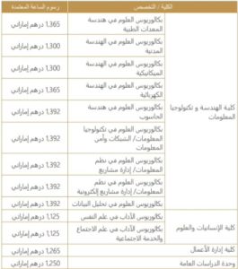 تبلغ رسوم القبول وطلب الالتحاق في برامج الدراسات الجامعية و برامج دبلوم الدارسات العليا 1,300 درهم إماراتي تسدد مرة واحدة عند تقديم الطالب وهي غير قابلة للاسترداد إلا في حالة عدم قبول الطالب (ة) حيث يسترد مبلغ 1,000 درهم فقط من رسوم
