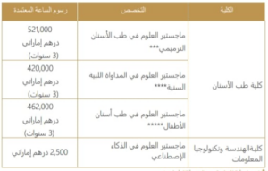 رسوم القبول وطلب الالتحاق في البرامج التي تطرحها الجامعة لنيل درجة الماجستير كلية الطب هي 2,000 درهم إماراتي تسدد مرة واحدة عند تقديم الطالب (ة) طلب الالتحاق، ولا تعتبر جزءاً من الرسوم الدراسية، وهي غير قابلة للاسترداد إلا في حالة عدم قبول الطالب (ة) حيث يسترد مبلغ 1,700 درهم فقط من رسوم التسجيل.